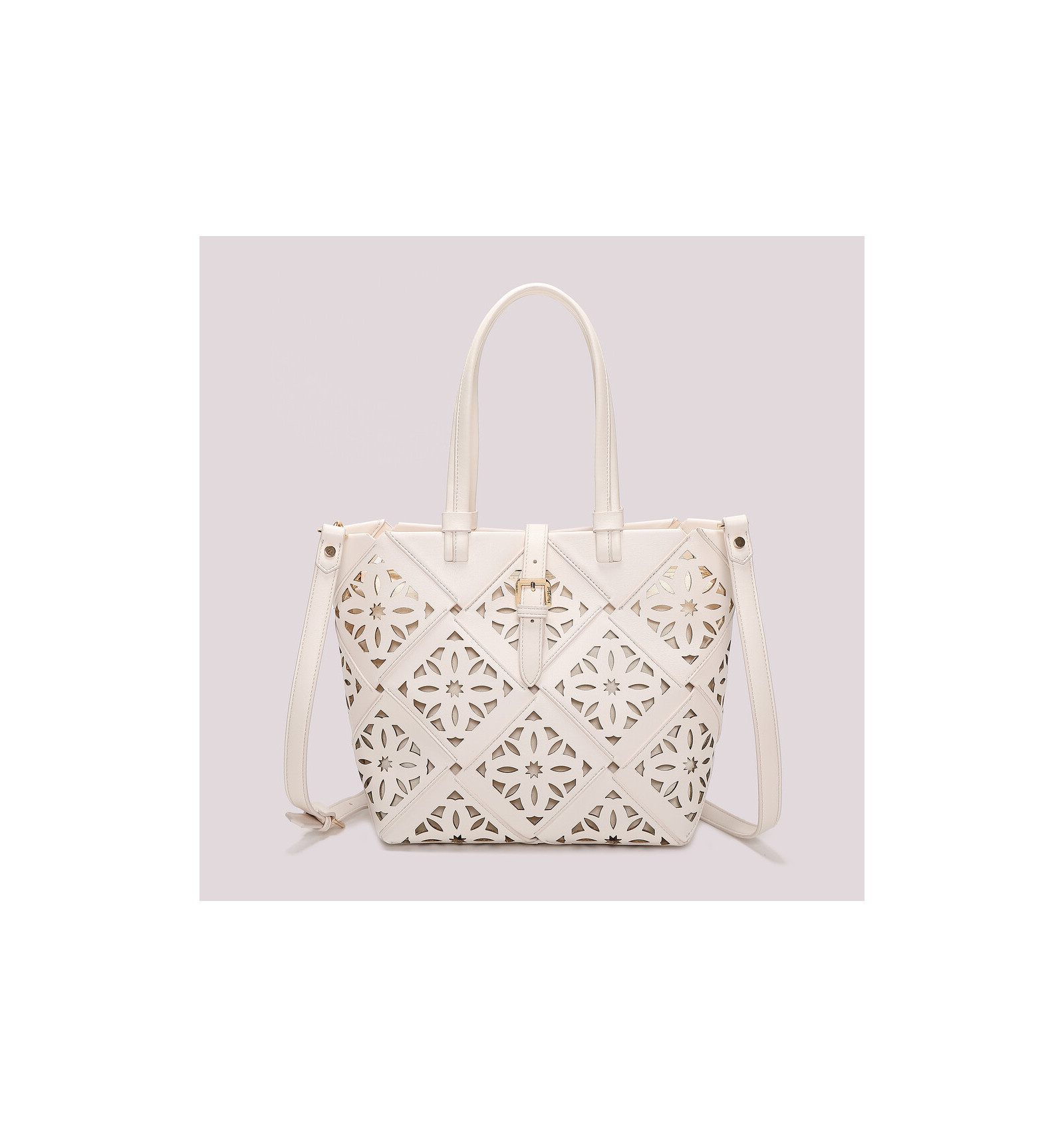 Colección Traforato, en piel sintética perforada haciendo un un dibujo estilo mosaico.