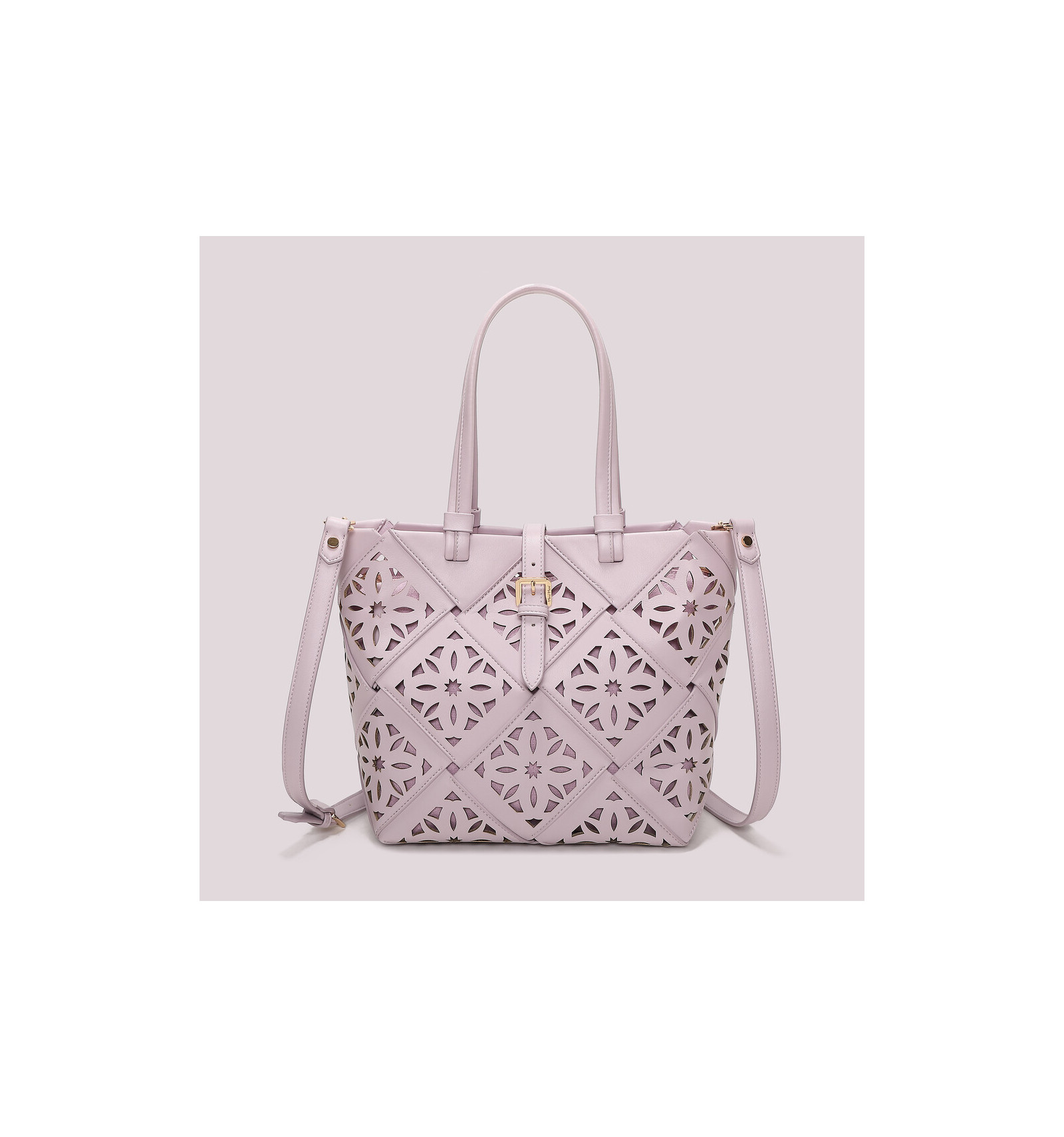 Colección Traforato, en piel sintética perforada haciendo un dibujo de estilo mosaico.