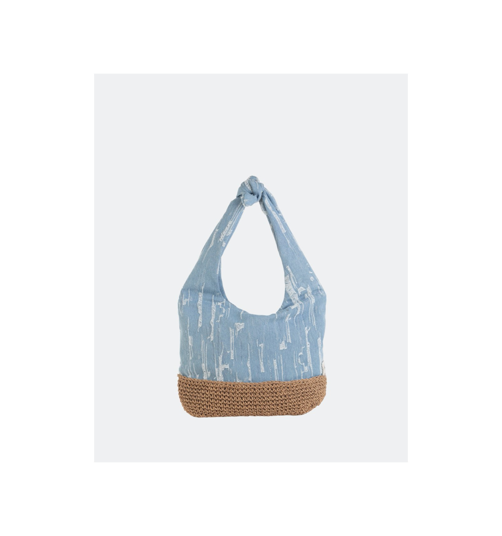 Colección Saona, combina tela vaquera lavada con rafia de papel.