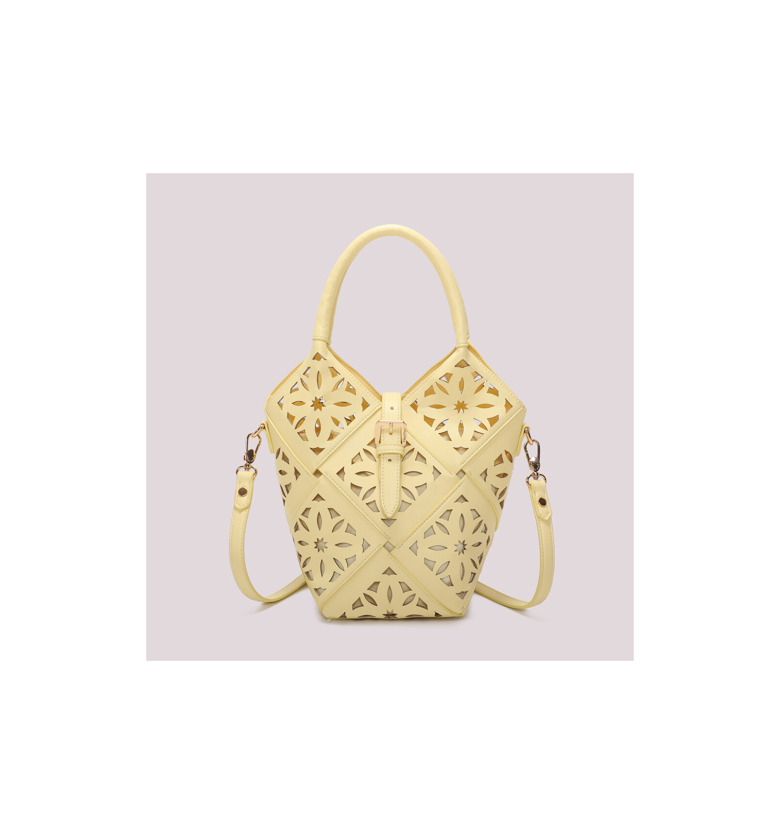 Colección Trafarato, en piel sintética perforada y haciendo un dibujo estilo mosaico.