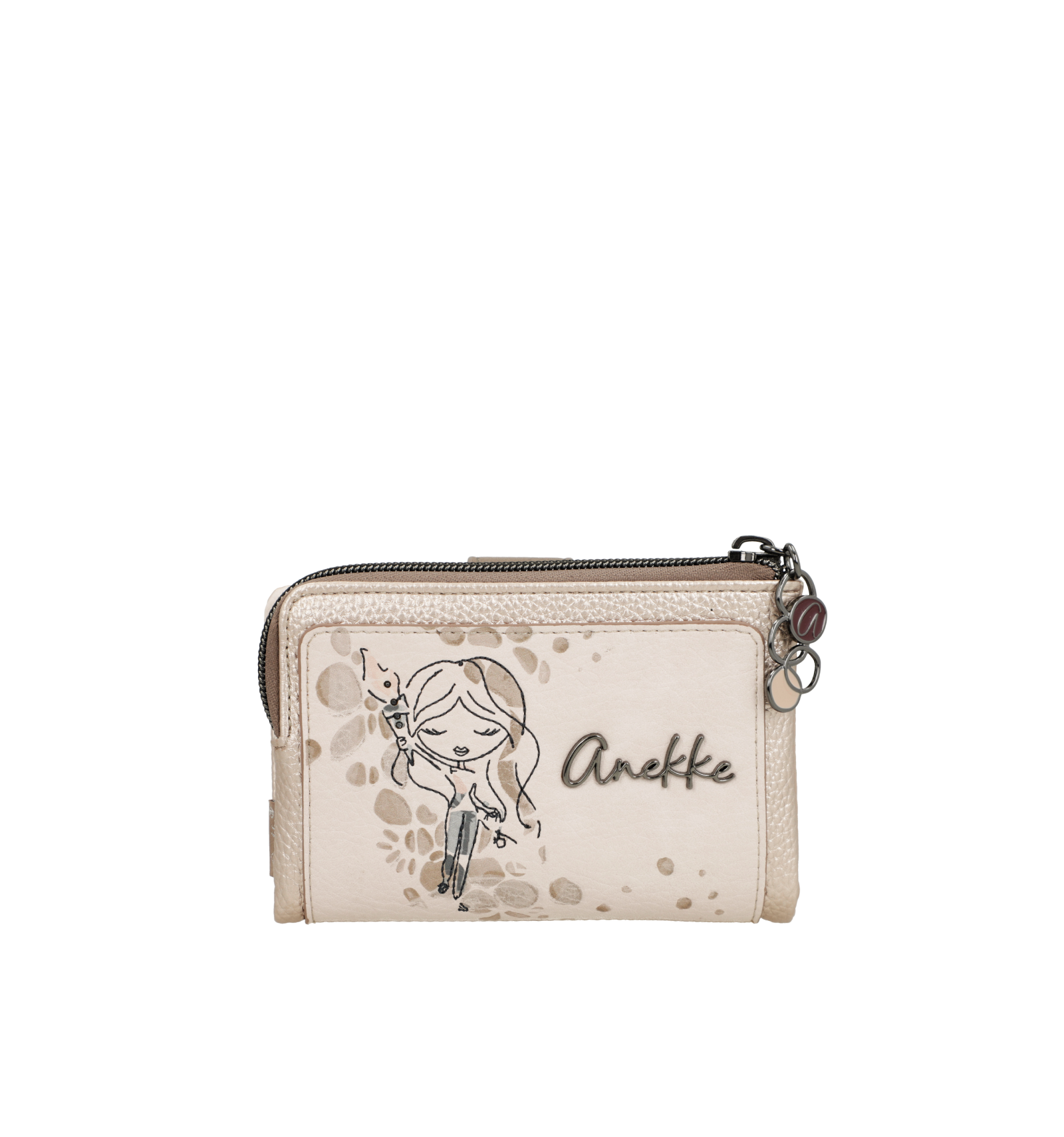 Compartimento delantero con cremallera para monedas.