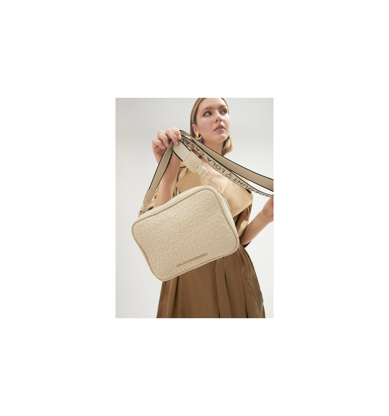 Doble bandolera intercambiable, una en piel sintética y otra en nylon con el logo en strass.